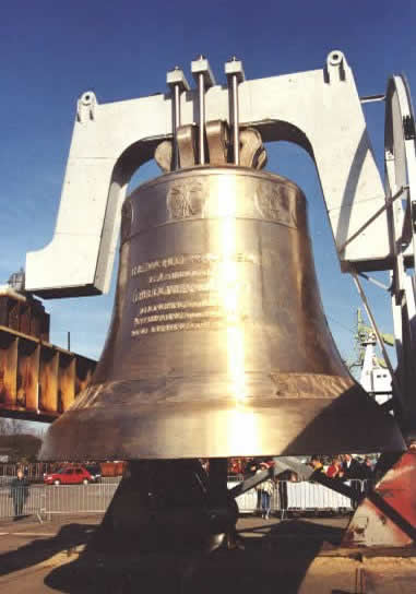 Sie wiegt exakt 33 285 Kg, ist 3,50 m hoch, und im Durchmesser 3,78 m. Das Totalgewicht in Bewegung beträgt 44 435 Kg. Der Klöppel aus gehärtetem Stahl wiegt 2650 Kg. Solche Massen können natürlich nicht mehr im Sekundenrythmus bewegt werden. Diese Glocke läutet mit 12 Schlägen pro Minute, und jeden einzelnen Schlag hört man 40 Km im Umkreis. Zur Herstellung der Gussform waren 4000 Ziegel, 150 Tonnen Sand und Schotter, und 350 Kg Wachs notwendig. Das Eingießen des 1023 °C heißen, flüssigen Metalls hat dann exakt 5 min 57 sek gedauert. Per Schiff wurde sie von Frankreich nach Amerika geliefert, wo sie von mehr als 100 000 begeisterten Menschen empfangen wurde. Danach wurde sie anläßlich des amerikanischen Nationalfeiertags in New Orleans der Bevölkerung offiziell vorgestellt, bevor sie an ihrem Bestimmungsort in Newport, Kentucky aufgestellt wurde um dann dort am 1. Jänner 2000 um 00h00 zu läuten.