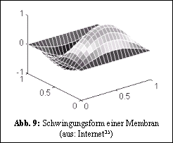 Stehende Wellen können sich nicht nur auf schwingenden Saiten, wie im Abschnitt 3.1.1 beschrieben, sondern auch auf angeschlagenen Platten ausbilden. Der deutsche Physiker CHLADNI (1756 - 1827) machte Versuche mit dünnen Platten, auf denen er mit Hilfe von feinem Sand die sog. Knotenlinien ohne Auslenkung und Zonen stärkerer Auslenkung, die jeweils gegenphasig schwingen, sichtbar machte. In Abb. 9 ist eine einfache Schwingungsform einer an den Rändern eingespannten Membran zu sehen, die sich vergleichbar einer Chladiniplatte verhält. Untersucht man die möglichen Frequenzen der Oberschwingungen dieser quadratischen Membran, so stellt sich heraus, dass sie mit der Grundfrequenz im allgemeinen nicht in einem musikalisch harmonischen Verhältnis stehen.