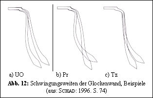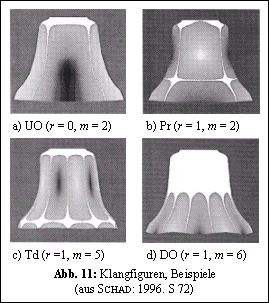 Seit den achtziger Jahren wird dabei eine moderne Computermethode angewendet: Die Finite-Elemente-Methode (FEM) reduziert den datenmäßig erfassten Glockenkörper auf berechenbare Grundbausteine, d. h. sie teilt die Glockenwand in kleine Ringelemente ein und errechnet aus ihnen bei bekannten Materialeigenschaften die Frequenzen der Eigenschwingungen. Da FEM auch die Verformung der Struktur angibt, können in erzeugten Bildern die Schwingungsbäuche und -knoten an der Graufärbung der Glocke abgelesen werden. In Abbildung 11 sind Beispiele dieser Klangfiguren dargestellt. Im Querschnitt und linear vergrößert kann man in Abb. 12 die Schwingungsweiten der Glockenwand miteinander vergleichen. (Abkürzungen der Teiltöne siehe Tab. 1)