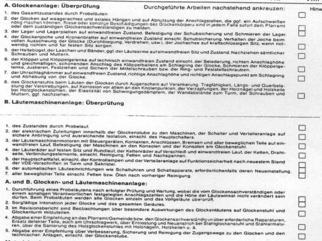 Eine Glockenwartung hat ihren Sinn und ist auch einmal jährlich erforderlich. Jedoch muß diese gewissenhaft durchgeführt werden und darf nicht mit einer Sichtkontrolle von statten gehen. Ferner rate ich ihnen, sich selber alle 3 Monate mal in die Glockenstube zu bemühen und dort wenigstens per Sichtkontrolle mal nach dem Rechten zu schauen.